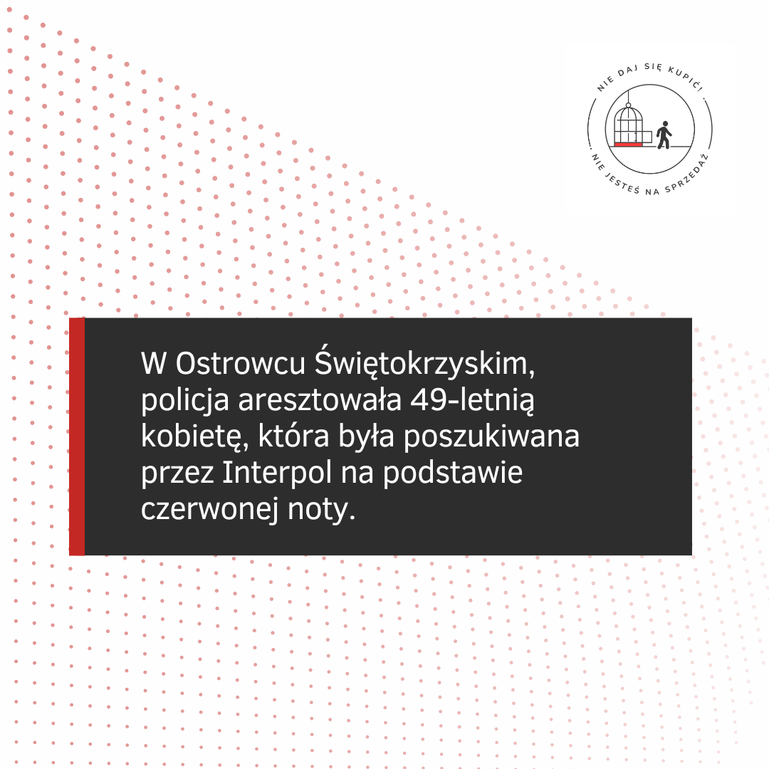 W Ostrowcu Świętokrzyskim, policja aresztowała 49-letnią kobietę, która była poszukiwana przez Interpol na podstawie czerwonej noty. Kobieta została skazana na 9 lat więzienia w Wielkiej Brytanii za różne przestępstwa, w tym za handel ludźmi. Informację tę podał st. asp. Artur Majchrzak, oficer prasowy Komendy Wojewódzkiej Policji w Kielcach.