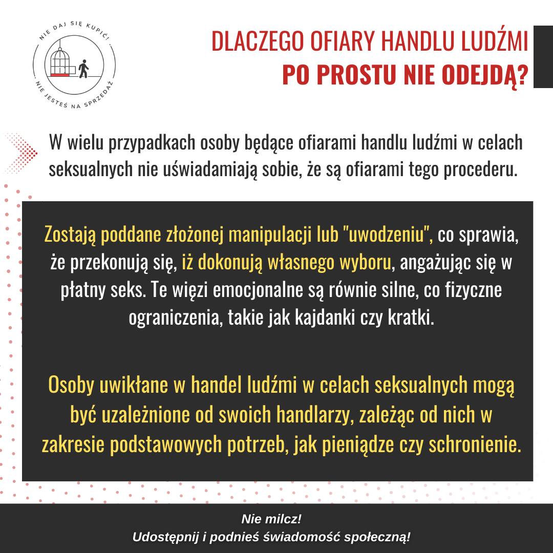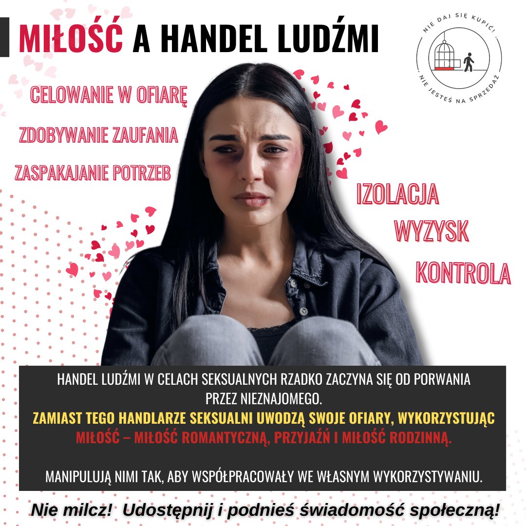♥️ Ach miłość.... w niewłaściwych rękach, potężna broń wyzysku. 💔Często miłość staje się główną bronią wykorzystywaną w operacjach handlu ludźmi w celach seksualnych. Wbrew powszechnemu błędnemu przekonaniu, rzadko zdarza się, aby handel ludźmi w ten sposób rozpoczynał się od porwania przez nieznajomego. ❓Jak to działa❓ 1️⃣Celowanie w ofiarę: Handlarze ludźmi szukają osób, które mają potrzeby emocjonalne lub materialne, które nie są zaspokajane. Celują np. w nastolatków, którym brakuje pewności siebie, młodych dorosłych, którzy publikują w Internecie posty o złym rozstaniu. 2️⃣Zdobywanie zaufania: Handlarze ludźmi poznają swoje ofiary i wykorzystują to, czego się uczą, aby wyglądało na to, że są idealnymi partnerami, odpowiedzią na marzenia ofiary, osobą, na którą mogą liczyć. Słuchają, wspierają i czekają na swój czas. 3️⃣Zaspokajanie potrzeb: Kiedy handlarze wiedzą, czego ich ofiary pragną lub potrzebują -dają im to – pozwalając im posmakować, jak to jest być kochanym, bezpiecznym lub docenionym np. poprzez prezenty. 4️⃣Izolacja: W miarę rozwoju relacji handlarz powoli odcina ofiarę od przyjaciół i bliskich, wzmacniając poczucie zależności. 5️⃣Wyzysk: To może zacząć się powoli, od poproszenia ofiary o seks za pieniądze "tylko ten jeden raz" lub "żeby mi pomóc". Z czasem staje się to normalne, tak że ofiara myśli, że sama podejmuje decyzję. 6️⃣Utrzymanie kontroli: Oprócz gróźb i kontroli ekonomicznej, handlarze ludźmi stosują nagrody i kary – strach i przemoc wraz z dobrocią i troską, aby stworzyć więzi traumatyczne, które utrudniają ofiarom uporządkowanie swoich uczuć i podjęcie decyzji o odejściu, nawet jeśli są do tego fizycznie zdolne.