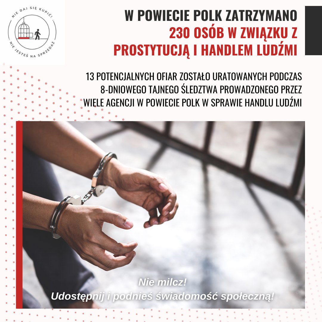 ❗Wstrząsające fakty ujrzały światło dzienne w ostatnich dniach. W ramach operacji „March Sadness 2024” przeprowadzonej przez Biuro Szeryfa Powiatu Polk, aż 230 osób zostało zatrzymanych w związku z handlem ludźmi i prostytucją. 👉Podczas 8-dniowego śledztwa, które zaowocowało aresztowaniem 150 osób, aż 13 potencjalnych ofiar zostało uratowanych. Ta liczba to nie tylko liczby - to ludzie, którzy byli narażeni na przemoc i wyzysk. ▶️Dzięki determinacji i współpracy wielu agencji, udało się postawić zarzuty w łącznej liczbie 70 przestępstw i 288 wykroczeń. To dowód na to, że walka z handlem ludźmi jest naszym wspólnym obowiązkiem. ➡️ Warto podkreślić, że w ciągu ostatniego roku, dzięki operacjom prowadzonym przez Biuro Szeryfa Powiatu Polk, zidentyfikowano aż 58 potencjalnych ofiar handlu ludźmi.