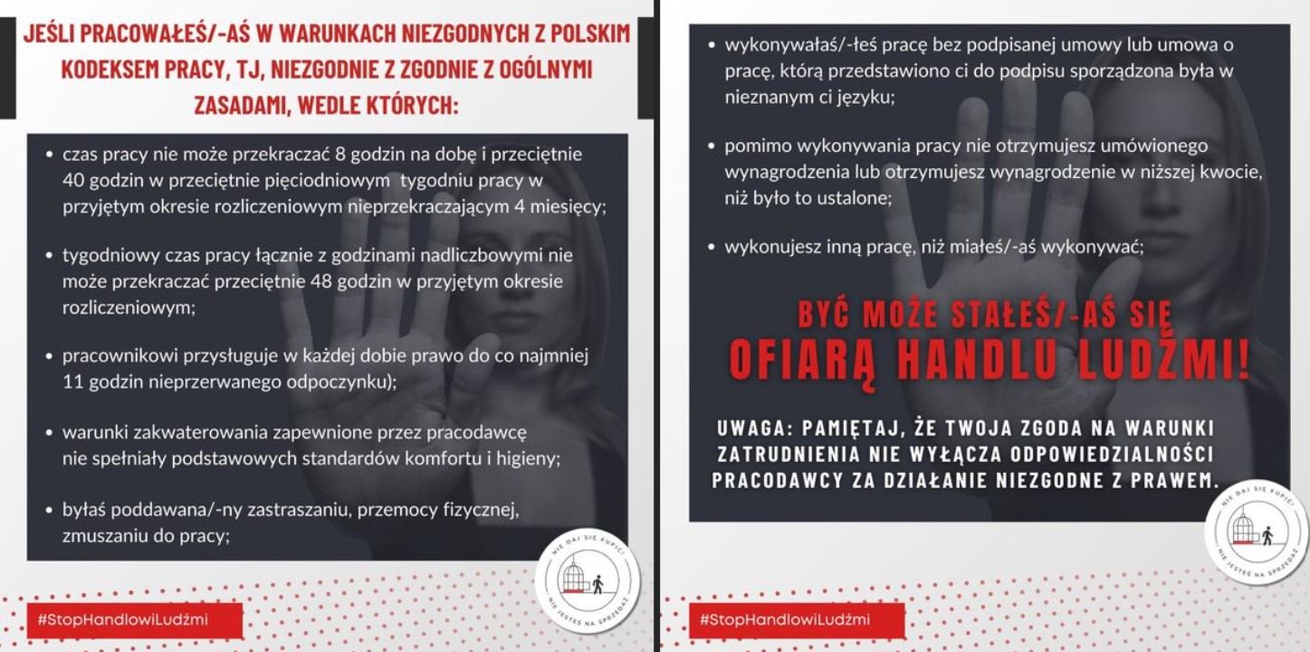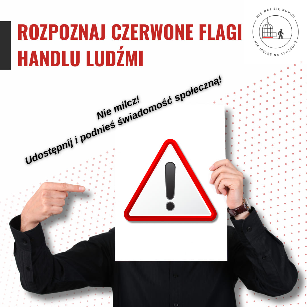 ⚠️Handel ludźmi to drastyczne łamanie praw człowieka, które często ma miejsce tuż obok nas, nawet bez naszej świadomości. Oto kilka ostrzeżeń, na które należy zwrócić uwagę: 🚩 Presja związana z pracą: jeśli ktoś czuje się zmuszony do pozostania w pracy lub sytuacji, której chciałby uniknąć, może to być oznaka handlu ludźmi. 🚩 Długi i brak zapłaty: osoby winne pieniądze pracodawcy lub rekruterowi, lub które nie otrzymują obiecanej zapłaty, mogą być ofiarami wykorzystania. 🚩 Brak kontroli nad paszportem lub innymi dokumentami tożsamości może wskazywać na handel ludźmi. 🚩 Warunki izolacji: życie i praca w odizolowanych warunkach, bez możliwości interakcji z innymi lub wsparcia, może być oznaką wykorzystywania. 🚩 Nadzór i kontrola: osoby sprawiające wrażenie, że są monitorowane przez inne osoby podczas rozmowy lub interakcji, mogą być ofiarami handlu ludźmi. 🚩 Niebezpieczne warunki życia i pracy: pracowanie w niebezpiecznych warunkach, groźby deportacji lub krzywdy, to sygnały alarmowe, na które należy zwrócić uwagę. ‼️ Jeśli zauważysz któreś z tych oznak, nie bądź obojętny! Możesz pomóc zgłaszając podejrzenia odpowiednim służbom lub organizacjom zajmującym się walką z handlem ludźmi. ❤️ Twoje działanie może uratować życie.