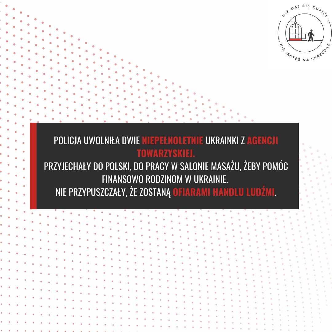 Dwie niepełnoletnie Ukrainki przyjechały do Polski, żeby pomóc rodzinie w Ukrainie. Znalazły pracę w Krakowie, w salonie masażu. Nie spodziewały się, że zostaną ofiarami handlu ludźmi- zostały pozbawione dokumentów i zmuszone do pracy w agencji towarzyskiej.