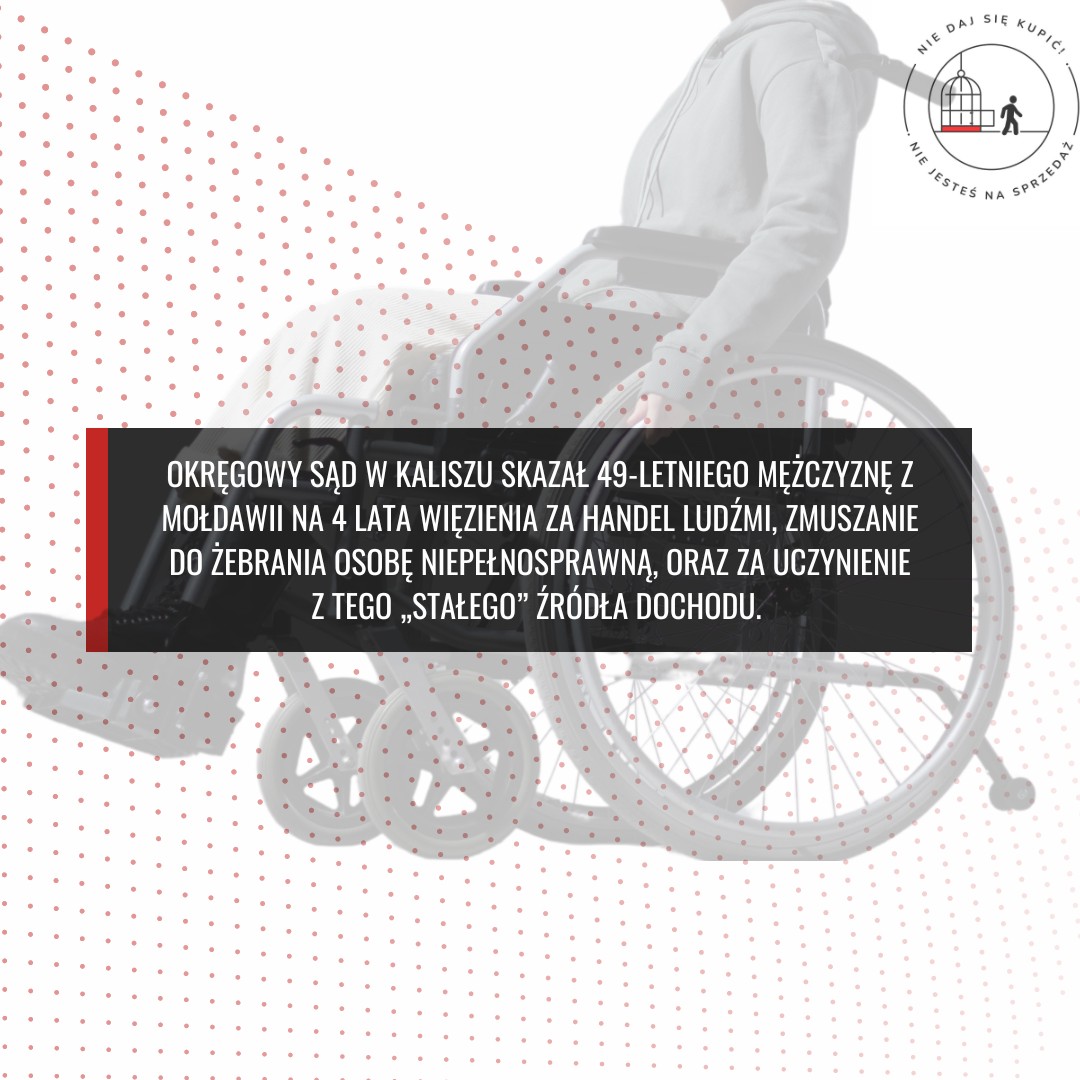 🚨Sąd Okręgowy w Kaliszu skazał 49-letniego mężczyznę z Mołdawii na 4 lata więzienia za handel ludźmi, zmuszanie do żebrania, oraz za uczynienie z tego „stałego” źródła dochodu. 🧑‍✈️🏢 Pod koniec października 2022 roku sprawa wyszła na jaw, gdy funkcjonariusze Komendy Miejskiej Policji w Kaliszu otrzymali informację od klienta sklepu, że pod jednym z marketów znajduje się niepełnosprawny mężczyzna na wózku inwalidzkim, który poprosił o pomoc. Okazało się, że ten człowiek był zmuszany do żebractwa. Policjanci, którzy interweniowali, szybko ustalili, że jest to 50-letni obywatel Łotwy. 😮🛒🆘